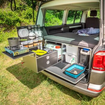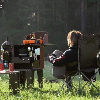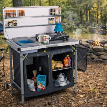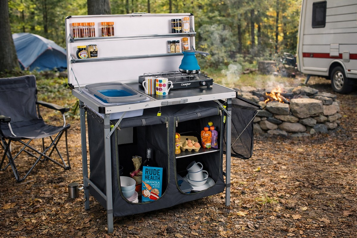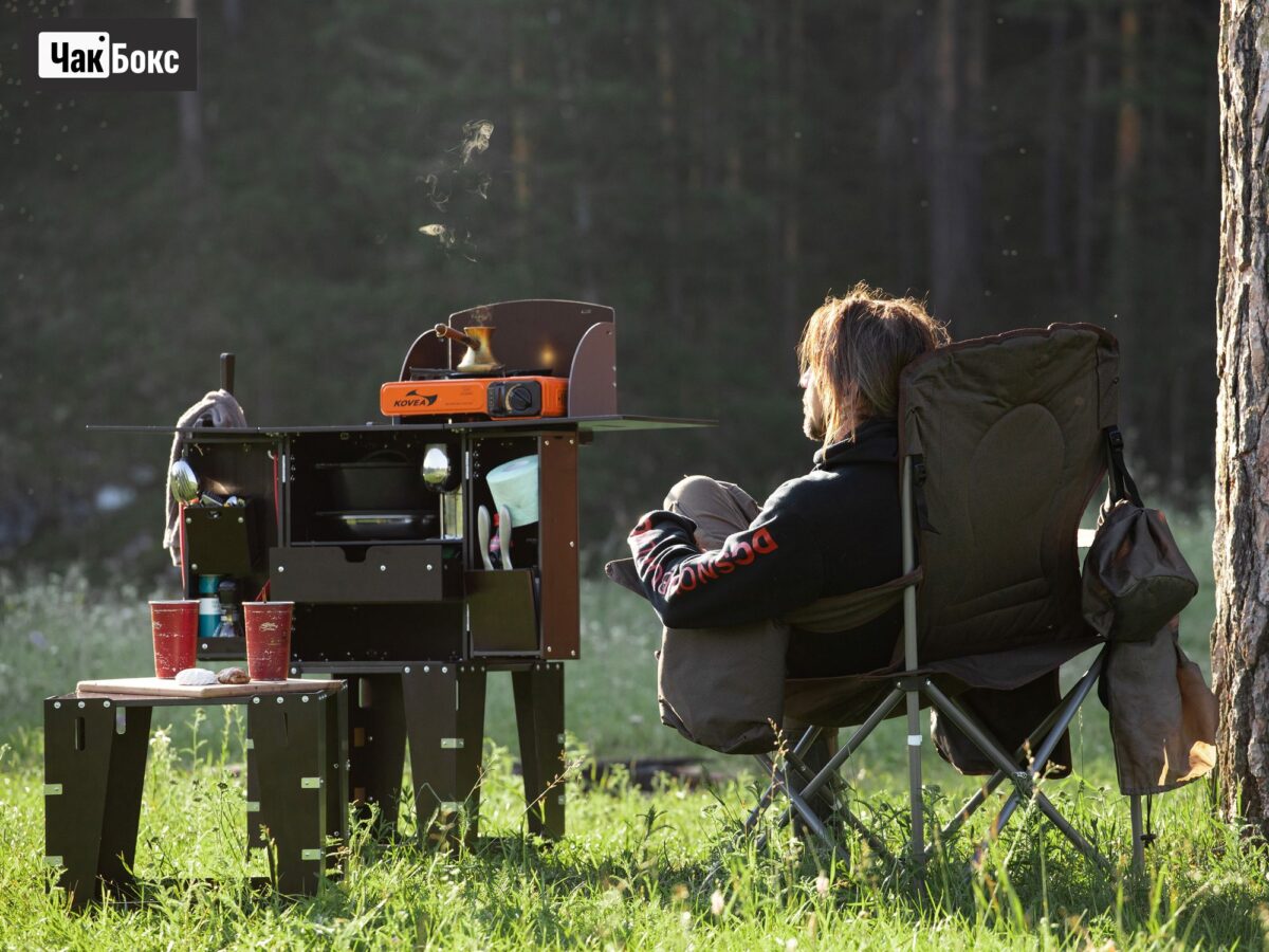 Для кемперов без встроенной кухни или для компаний от 4–6 человек идеальны раскладные уличные кухни. За считанные секунды они превращаются в полноценную рабочую зону: столешница, мойка, место под газовую плитку, полки и ящики для специй/посуды.
