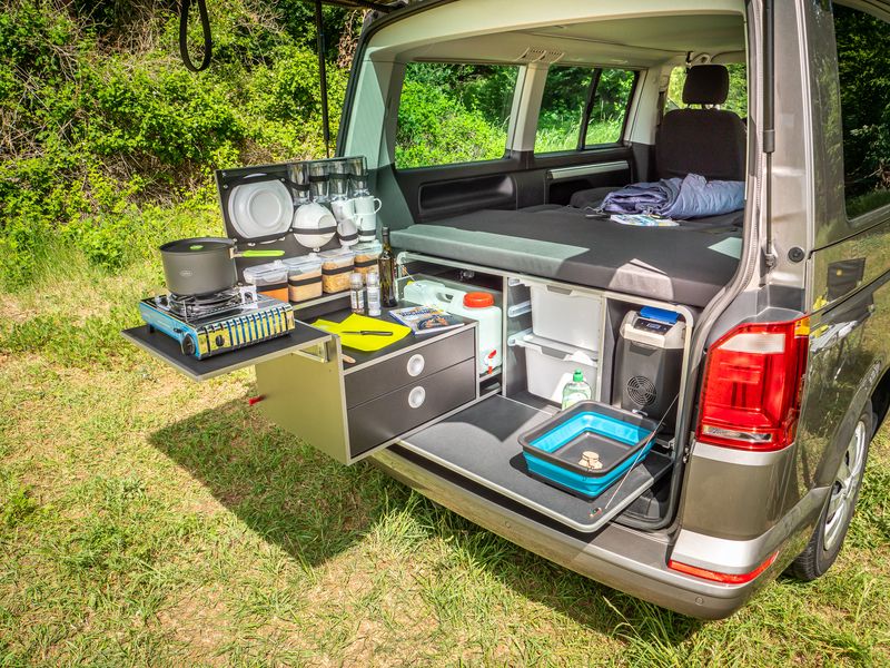 Модели с выдвижными контейнерами и ветрозащитой позволяют готовить на свежем воздухе, не разнося запахи и пар внутри кемпера. Преимущества уличных кухонь: чистота в салоне, удобство и возможность готовить большой объём еды без тесноты.